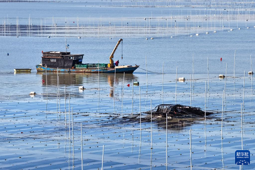 1月8日,漁民在江蘇連云港市海州灣漁場養(yǎng)殖區(qū)收獲條斑紫菜(無人機照片)。(新華社發(fā) 王健民 攝)