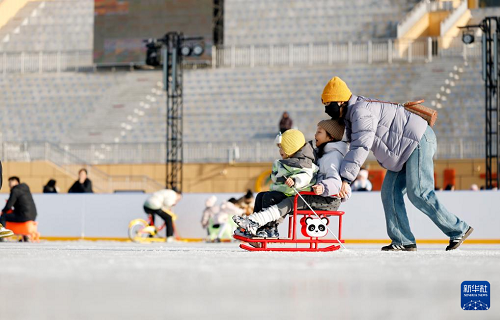 1月17日,人們?cè)阢y川文旅集團(tuán)覽山公園落日冰場(chǎng)玩耍。(新華社記者 王鵬 攝)