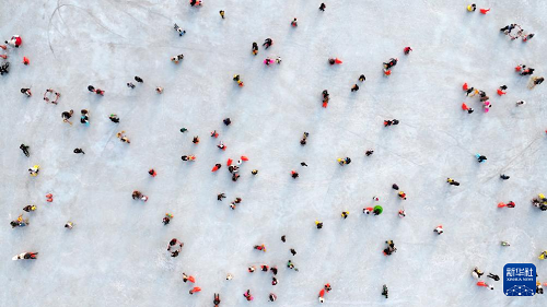 1月17日,市民在銀川文旅集團(tuán)覽山公園落日冰場(chǎng)玩耍(無(wú)人機(jī)照片)。(新華社記者 王鵬 攝)