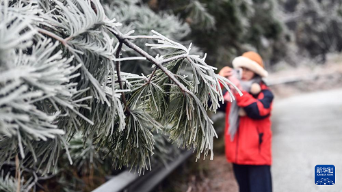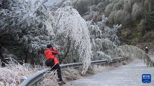 1月21日,一名游客在三江侗族自治縣大塘坳水庫附近觀賞冰凌。(新華社記者 張愛林 攝)