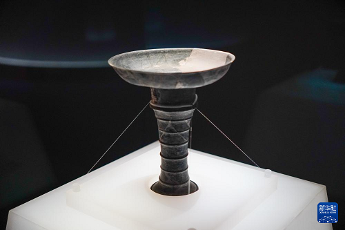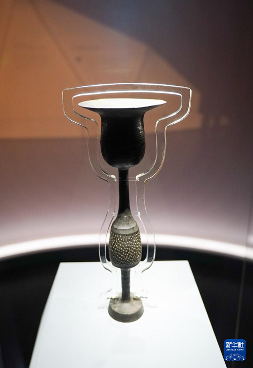 這是1月27日在山東博物館“對話蛋殼黑陶高柄杯”明星文物展上拍攝的龍山文化蛋殼黑陶高柄杯。(新華社記者 徐速繪 攝)