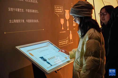 1月27日,觀眾在山東博物館參觀“對話蛋殼黑陶高柄杯”明星文物展。(新華社記者 徐速繪 攝)
