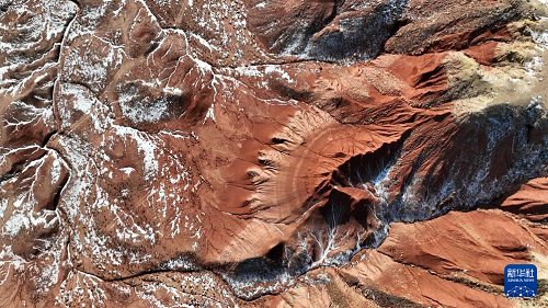 紅崖臺地位于內蒙古烏蘭察布市四子王旗北部,是內蒙古四子王國家地質公園的重要組成部分。這里山丘聳立、溝壑縱橫,山體呈現(xiàn)赤紅色。隆冬時節(jié),稀薄殘雪點綴其間,在蒼茫天地中勾勒出一幅靜謐而壯麗的自然畫卷。