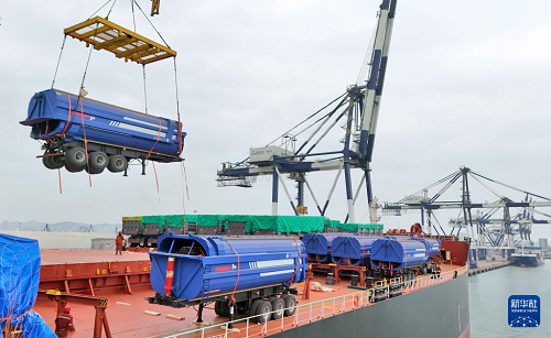 2月24日,在山東港口煙臺(tái)港,工人將出口卡車吊裝上船(無人機(jī)照片)。(新華社發(fā) 唐克 攝)