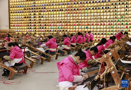 2月24日,在湖南省張家界市武陵源區(qū)乖幺妹土家族織錦生產(chǎn)研發(fā)基地,工人制作土家族織錦產(chǎn)品。(新華社發(fā) 吳勇兵 攝)