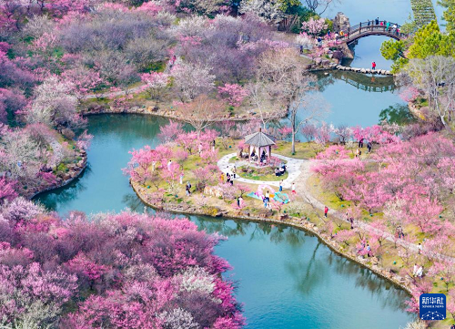 2月25日,游客在江蘇揚州瘦西湖風景區(qū)賞梅游玩(無人機照片)。(新華社發(fā) 周社根 攝)