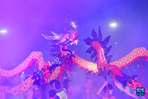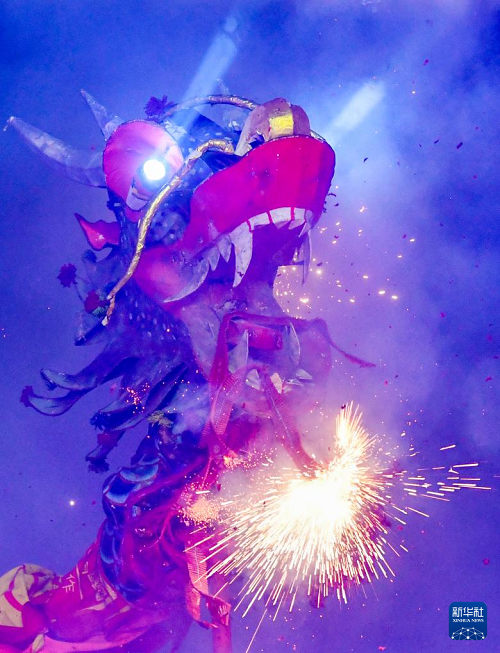 2月27日,在廣西賓陽縣炮龍文化廣場(chǎng),人們?cè)谂邶埞?jié)上舞炮龍。(新華社記者 陸波岸 攝)