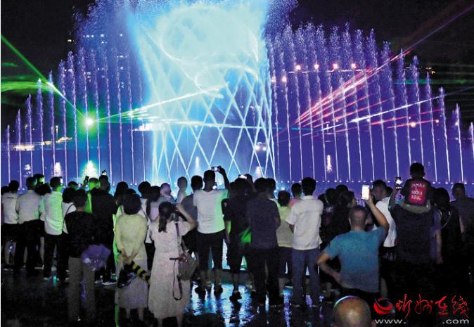 公園在注重園林、景觀建設(shè)的同時(shí),突出主題文化內(nèi)涵的展現(xiàn),湖水噴泉、觀賞果園、主題植物園、階梯花臺等特色園林具有觀賞性,園內(nèi)還配套建有遺山文化館、張拉膜廣場、健舞劇場、休閑茶吧、咖啡館等群眾休閑活動場所,是又一惠及民生的心靈家園。圖為8月1日晚,市民在遺山公園噴泉廣場觀賞絢麗多彩的噴泉燈光秀。劉紀(jì)森 智芝龍 白曉明 胡 煒 攝