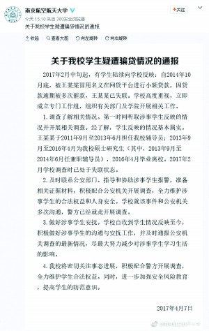在4月7日下午,“@南京航空航天大學(xué)”官微發(fā)布了“關(guān)于我校學(xué)生疑遭騙貸情況的通報”,通報稱,從2017年2月中旬起,有學(xué)生陸續(xù)向?qū)W校反映,自2014年10月底,被王某冒用名義在網(wǎng)貸平臺進行小額貸款,因貸款逾期被多次催款,王某已失聯(lián)。學(xué)校高度重視,立即成立專門工作組,組織有關(guān)部門及學(xué)院開展相關(guān)工作。經(jīng)調(diào)查了解,學(xué)生反映的情況基本屬實。