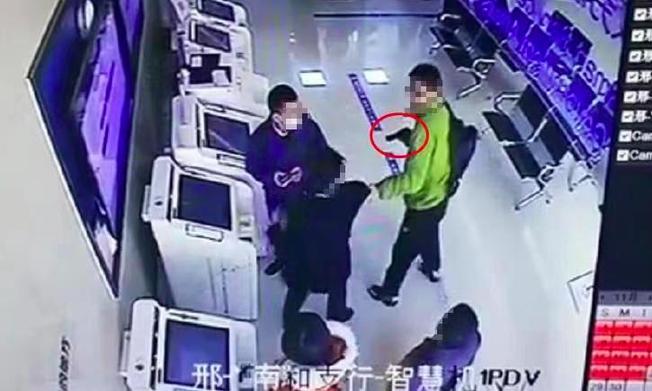 一開(kāi)始,銀行工作人員正在幫助客戶操作自助系統(tǒng),一名身穿綠衣服男子右手持“槍”威脅,左手拉扯工作人員。全程20多秒,女工作人員、客戶、搶劫者仿佛商量好的一般淡定自若,氣氛非常尷尬。見(jiàn)沒(méi)人搭理,男子站了一會(huì)兒便自行離開(kāi)。