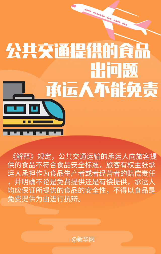 《解釋》規(guī)定,公共交通運輸?shù)某羞\人向旅客提供的食品不符合食品安全標(biāo)準(zhǔn),旅客有權(quán)主張承運人承擔(dān)作為食品生產(chǎn)者或者經(jīng)營者的賠償責(zé)任,并明確不論是免費提供還是有償提供,承運人均應(yīng)保證所提供的食品的安全性,不得以食品是免費提供為由進(jìn)行抗辯。