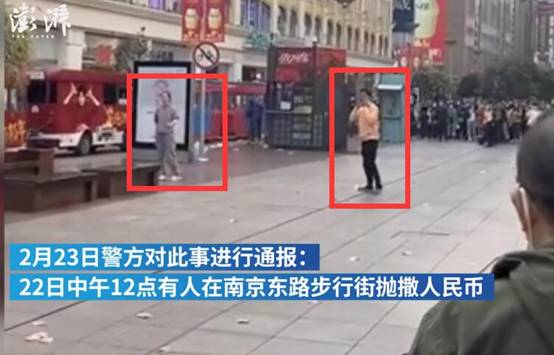 據(jù)澎湃新聞,2月22日12時左右,上海南京東路步行街有一男一女拋撒人民幣,民警接到報警后,將肇事男女帶走,并將地上的紙幣收回。初步調(diào)查,二人系姐弟,均于2019年4月被診斷為患有精神疾病。