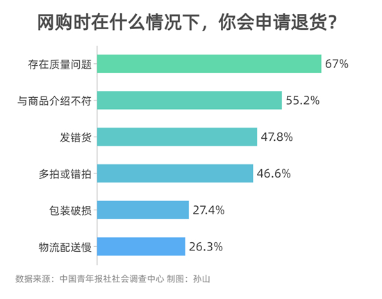 數(shù)據(jù)顯示,存在質(zhì)量問(wèn)題(67.0%)是受訪者退貨的主要情況,然后是與商品介紹不符(55.2%)。其他還有:發(fā)錯(cuò)貨(47.8%)、多拍或錯(cuò)拍(46.6%)、包裝破損(27.4%)、物流配送慢(26.3%)等。