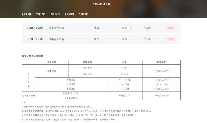古代中國展收費(fèi)講解項目及標(biāo)準(zhǔn) 截圖自國家博物館官網(wǎng)