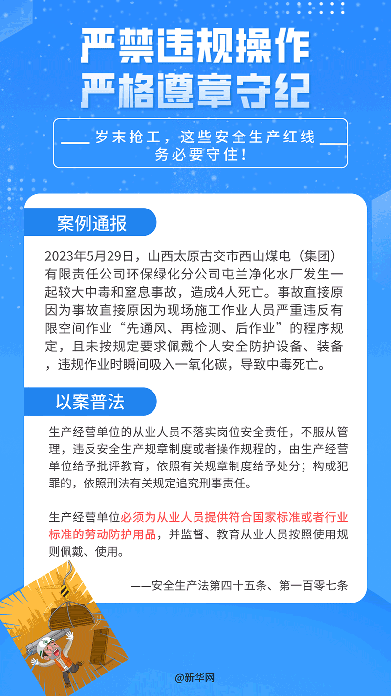 12月1日至7日是第七個安全生產(chǎn)法宣傳周,又恰逢歲末年初,生產(chǎn)經(jīng)營建設(shè)活動進(jìn)入旺季,一些企業(yè)搶工期、趕進(jìn)度,人們思想管理容易產(chǎn)生松懈麻痹的疲勞期,也是生產(chǎn)事故的高發(fā)期。以下是近期各地通報的部分案例,希望大家銘記安全,警鐘長鳴!