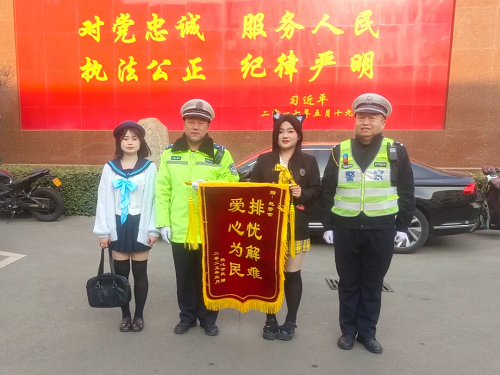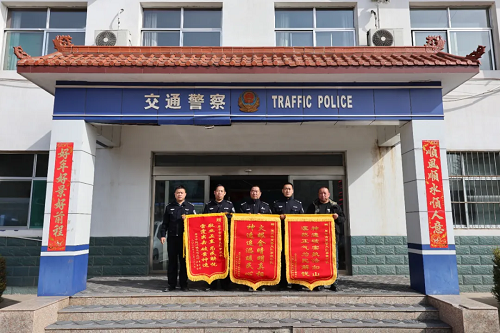 原來,3月9日下午,該女士不慎將手機(jī)丟失,急忙跑到和平街七一路口的崗?fù)ふ医痪瘞兔?。正在?zhí)勤的趙鐵東同志立即用自己的手機(jī)幫忙報(bào)110接警平臺,同時耐心地反復(fù)撥打失主的手機(jī)號碼,兩個多小時后終于撥通并在人民公園找到手機(jī)。兩日后失主專程送來錦旗以示謝意! 02 原平交警快速偵破交通肇事逃逸案件 3月13日,原平市同川鎮(zhèn)上社村的郝先生、閆莊村的樊先生l來到原平市公安局交警大隊(duì)事故中隊(duì),將印有“火眼金睛明真相 神速追逃暖民心”“神速破案執(zhí)法如山 凜然正氣為民解憂”的錦旗送到民警手中,以表達(dá)對交警心系群眾、履職盡責(zé)、迅速破案的感激之情。