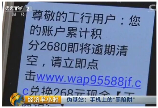 近日央視報(bào)道了湖北警方破獲的一系列短信詐騙案件。案件中,犯罪嫌疑人利用偽基站不定向向群眾發(fā)送冒充銀行的詐騙短信,通過發(fā)送有關(guān)積分兌換的信息騙取受害人的支付驗(yàn)證碼,轉(zhuǎn)走受害人銀行卡內(nèi)的5000元錢。安全專家提醒,偽基站欺詐短信猖獗,已成近幾年對(duì)用戶財(cái)產(chǎn)危害最大的欺詐類型,用戶需注意防范。