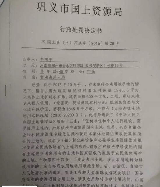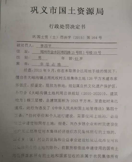 據(jù)記者獲取的材料顯示,2015年12月份,鞏義市國土資源局對李四平進(jìn)行處罰,案由為“非法占地”。李四平擅自占用集體土地126平方米,建設(shè)農(nóng)家樂,土地性質(zhì)為林地。對其處罰為“自行拆除在非法占用的126平方米土地上新建的建筑物和其他設(shè)施,恢復(fù)土地原狀”“對非法占用的126平方米土地,按每平方米3元處以罰款,共378元。”