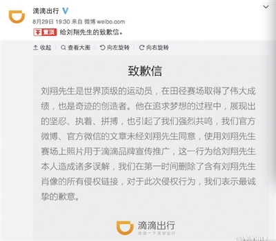 29日晚間,滴滴出行在其官方微博中發(fā)布了“給劉翔先生的致歉信”,承認未經(jīng)同意使用劉翔相關照片用于推廣,已造成侵權(quán)。新京報記者了解到,另一家涉及侵權(quán)的公司極路由也已向劉翔公開致歉。