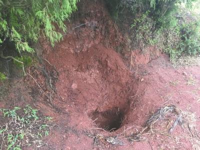 順著吳大爺?shù)闹敢浾叽┻^一片蘆葦?shù)?,整條山路雜草叢生,無路可尋。在山頂?shù)囊豢冒貥湎?,記者找到了尸體被埋處,一個約半米深、寬半米的泥坑,樹根裸露在外,周圍新翻的泥土掩蓋了雜草?,F(xiàn)場還有警方取證時留下使用過的一次性手套。