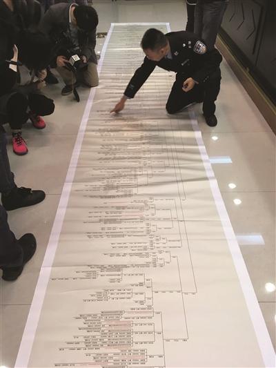 當(dāng)時(shí)公安信息化不是很發(fā)達(dá),家譜上的姓名和公安機(jī)關(guān)戶籍系統(tǒng)中的姓名有出入。民警將上千名家譜中的男性逐一翻拍,回南京后再根據(jù)翻拍的家譜照片,按照每一個(gè)人的血緣、親緣、家庭關(guān)系,逐人核對(duì)、逐人梳理。由于當(dāng)?shù)丶易宄蓡T關(guān)系非常復(fù)雜,民警足足耗時(shí)兩個(gè)多月,制作出了一份長(zhǎng)達(dá)6.8米的家譜關(guān)系圖。
