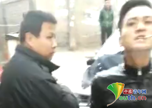 視頻中,與幾名穿黑衣制服男子一同出現(xiàn)的還有一輛沒有牌照、車門上印有“城管”字樣的車輛。在這段48秒的視頻中,一位身穿黑色制服的男子口出污言穢語(yǔ)近十次,并兩次上前推打視頻拍攝者。