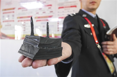 昨日,民警展示盜竊團(tuán)伙用來扎汽車輪胎的作案工具“膠皮釘”。新京報(bào)記者 王嘉寧 攝