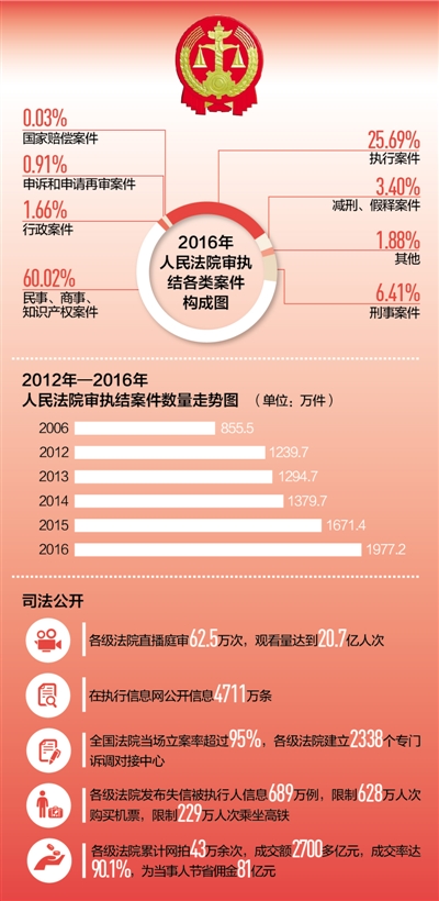 2016年,各級法院向執(zhí)行難全面宣戰(zhàn),共受理執(zhí)行案件614.9萬件,執(zhí)結(jié)507.9萬件,同比分別上升31.6%和33.1%,執(zhí)行到位金額1.5萬億元,同比上升54%。與公安部等10多個部門建立網(wǎng)絡(luò)執(zhí)行查控系統(tǒng),執(zhí)行法官足不出戶即可依法查詢被執(zhí)行人財產(chǎn)和相關(guān)信息,實現(xiàn)了執(zhí)行模式的根本變革。發(fā)布失信被執(zhí)行人信息689萬例,限制628萬人次購買機票,限制229萬人次乘坐高鐵。依法懲治拒不執(zhí)行裁判行為,司法拘留1.6萬人,追究刑事責(zé)任2167人,讓司法裁判真正成為懲治違法失信的利劍。