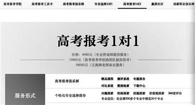 北青報記者發(fā)現(xiàn),面對考生家長對于志愿填報的“迫切需求”,目前高考志愿填報咨詢的價格都在幾千元到幾萬元不等。這位潘姓工作人員表示,該機構(gòu)設(shè)有線上、線下志愿填報兩套方案,其中線上填報方案價格為3980元,志愿填報咨詢老師與學(xué)生并不見面,而是通過QQ、郵件等方式為學(xué)生和家長出具志愿填報方案。而線下志愿填報方案為1對1有針對性的填報,但是根據(jù)咨詢經(jīng)驗的多寡收費也不相同?!氨热缥覀冇衅甙四晷袠I(yè)經(jīng)驗的呂老師收費是22800元,有6年經(jīng)驗的郭老師收費是20800元,要是有3年經(jīng)驗的李老師收費則為16800元。”此外,一家名為融聚未來的機構(gòu)的高姓負(fù)責(zé)人也向記者介紹,該機構(gòu)高考志愿填報1對1服務(wù)的價格在8000元到2萬元以內(nèi)。最讓人吃驚的是,一家名為贏鼎教育的高考報考機構(gòu),在官網(wǎng)上明示的高考報考1對1項目中明確標(biāo)價,專業(yè)咨詢師提供服務(wù)的收費4980元,高考報考學(xué)創(chuàng)始團隊提供指導(dǎo)的收費為19800元,王海濤老師親自服務(wù)的標(biāo)價為98000元。