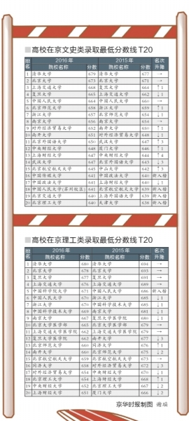 比較去年和今年各高校在京錄取最低分數(shù)線可以發(fā)現(xiàn),文理兩科“十大最難考”高?;敬_定。
