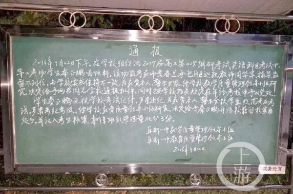 通報稱,在當(dāng)天下午學(xué)校組織的2017屆高三第二次調(diào)研考試英語科目考試中,第10考場學(xué)生秦正鵬喝飲料。“秦正鵬無視學(xué)??荚嚰o(jì)律,嚴(yán)重違紀(jì),為教育本人,警示全校學(xué)生,規(guī)范參加考試,嚴(yán)肅考紀(jì)考風(fēng)”,“決定給予秦正鵬開除校籍留校察看處分,并記入考生檔案?!?/span>