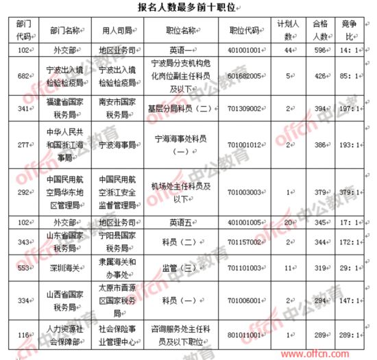 本次計(jì)劃招錄2.7萬(wàn)余人,目前平均競(jìng)爭(zhēng)比為5.52:1 ,17日的人氣職位與部門(mén)都出現(xiàn)了稍有變化。從報(bào)名人數(shù)上來(lái)看,外交部地區(qū)業(yè)務(wù)司(職位代碼401001001)的職位蟬聯(lián)“人氣之王”。此職位計(jì)劃招錄人數(shù)為此次招錄最多,預(yù)計(jì)此會(huì)成為眾多職位中最閃亮的“人氣之星”。去年同期,報(bào)名人數(shù)最多的職位有888人競(jìng)爭(zhēng)一個(gè)崗位,而今年的考生更趨理性,不再“扎堆”報(bào)考。寧波出入境檢驗(yàn)檢疫局(職位代碼601682005),因計(jì)劃招錄5人引來(lái)426名考生的“青睞”,在報(bào)名第三日逆襲成“人氣亞軍”。福建省國(guó)家稅務(wù)局(職位代碼701309002)一職,也在17日上午的排行榜中前進(jìn)2個(gè)名次,增加45人報(bào)考。