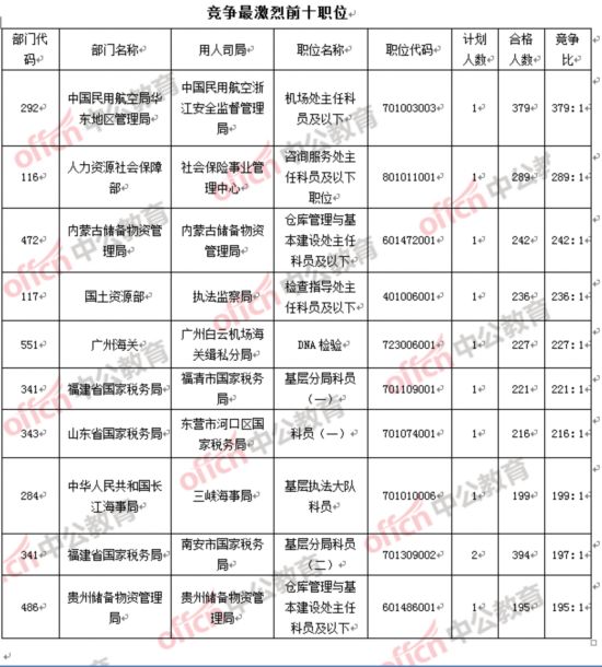 從競(jìng)爭(zhēng)比上來(lái)看,中國(guó)民用航空局華東地區(qū)管理局中國(guó)民用航空浙江安全監(jiān)督管理局機(jī)場(chǎng)處主任科員及以下(職位代碼701003003)一職與17日上午8時(shí)一樣,摘得“桂冠”。而人社部中國(guó)民用航空浙江安全監(jiān)督管理局(職位代碼801011001)一職后來(lái)居上,屈居亞軍。內(nèi)蒙古儲(chǔ)備物資管理局(職位代碼601472001)一職排名與16日一樣,但報(bào)名人數(shù)由16日的196人,增至242人。