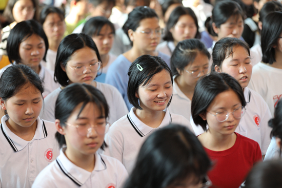 6月28日,湖南永州道縣第一中學(xué)學(xué)生在緊張準(zhǔn)備高考的同時(shí),參加心理講座,開展快樂減壓活動(dòng)。視覺中國(guó)供圖