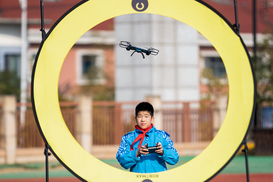 2021年12月14日,浙江省湖州市長興縣第一小學(xué)的學(xué)生操作無人機(jī)進(jìn)行穿越訓(xùn)練。 視覺中國供圖(資料圖片)