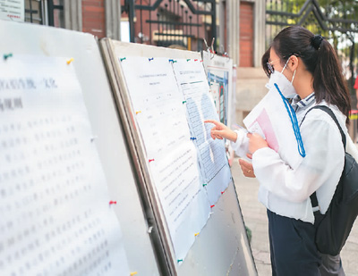 二○二二年七月七日,二○二二年上海市普通高等學(xué)校招生統(tǒng)一文化考試開考,五萬(wàn)多名考生奔赴考場(chǎng)。圖為上海格致中學(xué)考點(diǎn),考生查看考場(chǎng)信息。 王 初攝(人民視覺)