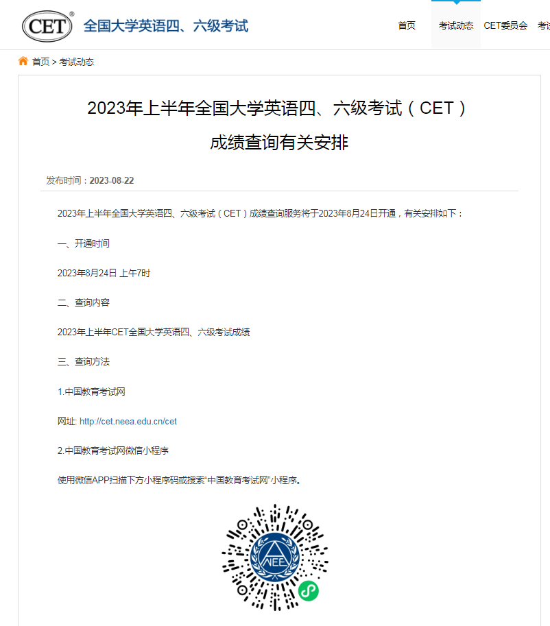 8月22日,中國教育考試網(wǎng)發(fā)布消息,2023年上半年全國大學英語四、六級考試(CET)成績查詢服務(wù)將于2023年8月24日上午7時開通。