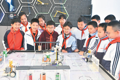 4月8日,浙江省建德市明珠小學(xué)勵珠機(jī)器人社團(tuán)的學(xué)生在科學(xué)老師指導(dǎo)下,正在體驗操作“九宮機(jī)器人”。寧文武攝(人民視覺)