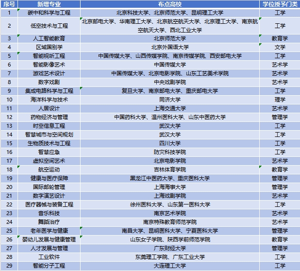 此外,從學位授予門類來說,工學專業(yè)較多,包括智能視聽工程、智能分子工程、智慧應急、智慧應急、時空信息工程、生物質技術與工程等;教育學專業(yè)包括人工智能教育、航空運動等。這其中,布點高校最多的專業(yè)為智能視聽工程,有4所高校設立。