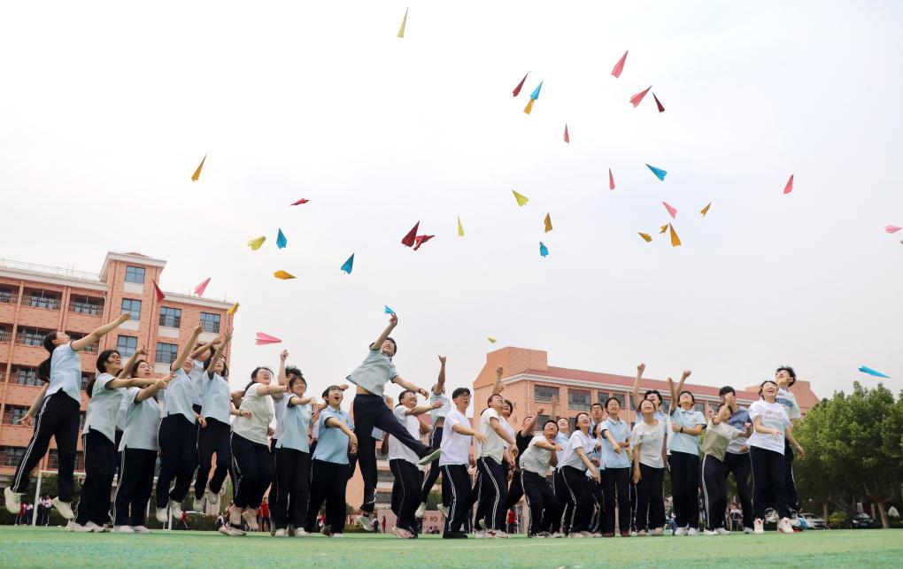 5月22日,在山東省高密市第五中學(xué),高三學(xué)生將寫有夢(mèng)想的紙飛機(jī)拋向空中。高考臨近,各地學(xué)校組織高三學(xué)生開(kāi)展不同形式的減壓活動(dòng),幫助學(xué)生放松心情,迎接高考。新華社發(fā)(李海濤攝)