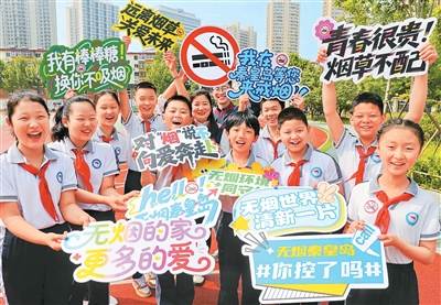 第38個“世界無煙日”到來之際,河北省秦皇島市疾控中心(市衛(wèi)生監(jiān)督所)工作人員走進秦皇島市第七中學(xué)玉龍灣校區(qū),為學(xué)生普及吸煙有害健康的相關(guān)知識。圖為工作人員和學(xué)生共同和禁煙標識、標語合影。曹建雄攝(人民視覺)