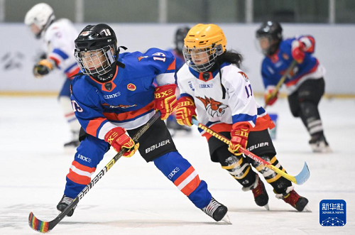 1月25日,在齊齊哈爾市的黑龍體育館內(nèi),二馬路小學(xué)翼虎冰球隊隊員劉金梓晨(左)在訓(xùn)練中。新華社記者 張濤 攝