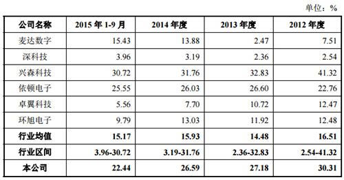 招股書顯示,易德龍負債水平偏高,流動負債占比超過95%,面臨較大的短期償債風險。而除了償債風險外,公司主營業(yè)務毛利率在報告期內持續(xù)下降,2012年為30.31%,到2015年9月末已降至22.44%,而同時期內行業(yè)銷售毛利率均值基本穩(wěn)定在27%左右。