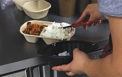 到下午三點多,這些成品菜會從加熱機(jī)中撈起,如果有人訂餐,就再放進(jìn)微波爐里加熱。賣不完的成品菜,晚上放入冷藏柜里,等第二天循環(huán)加熱,直到下一位顧客買走它。