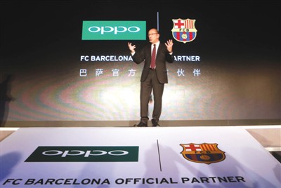 去年9月8日,西甲巴塞羅那俱樂部與OPPO手機在北京召開聯合新聞發(fā)布會,宣布自2015-2016賽季開始,OPPO正式成為巴塞羅那俱樂部官方合作伙伴。圖為巴塞羅那俱樂部副主席佩雷斯在新聞發(fā)布會上致辭。