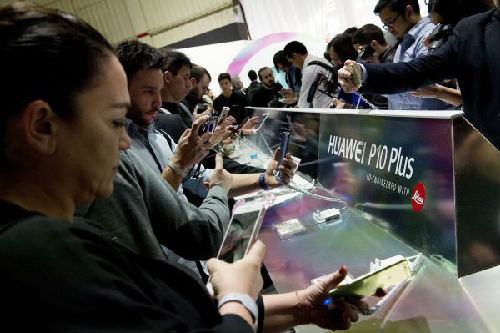 2月26日,在西班牙巴塞羅那舉行的世界移動(dòng)通信大會(huì)開(kāi)幕前,人們?cè)囉弥袊?guó)品牌華為新發(fā)布的P10和P10 Plus手機(jī)。(新華社)