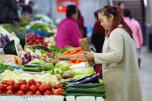 4月11日,南京市民在一家農(nóng)貿(mào)市場(chǎng)購(gòu)買(mǎi)蔬菜。新華社發(fā)(蘇陽(yáng)攝)