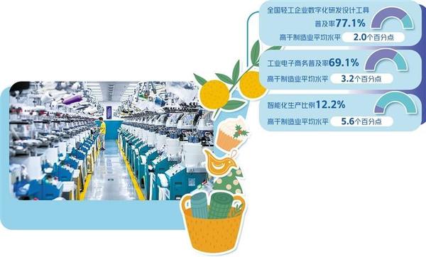 “以輕工業(yè)為例,全國輕工企業(yè)數(shù)字化研發(fā)設計工具普及率77.1%,工業(yè)電子商務普及率69.1%,分別高于制造業(yè)平均水平2.0個和3.2個百分點。”王孝洋說。