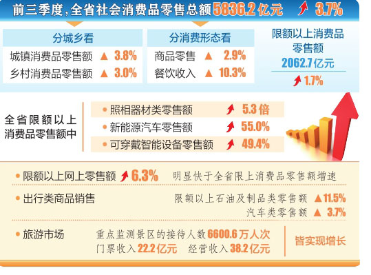 前三季度,全省消費(fèi)呈現(xiàn)哪些特點(diǎn)。據(jù)省統(tǒng)計(jì)局相關(guān)負(fù)責(zé)人介紹,新型消費(fèi)快速增長(zhǎng),全省限額以上消費(fèi)品零售額中,照相器材類零售額增長(zhǎng)5.3倍,新能源汽車零售額增長(zhǎng)55.0%,可穿戴智能設(shè)備零售額增長(zhǎng)49.4%。限額以上網(wǎng)上零售額增長(zhǎng)6.3%,明顯快于全省限上消費(fèi)品零售額增速;出行類商品銷售帶動(dòng)明顯,全省限額以上石油及制品類零售額增長(zhǎng)11.5%,汽車類零售額增長(zhǎng)3.7%;旅游市場(chǎng)持續(xù)回暖,全省重點(diǎn)監(jiān)測(cè)景區(qū)接待人數(shù)6600.6萬(wàn)人次,門票收入22.2億元,經(jīng)營(yíng)收入38.2億元,皆實(shí)現(xiàn)增長(zhǎng)。