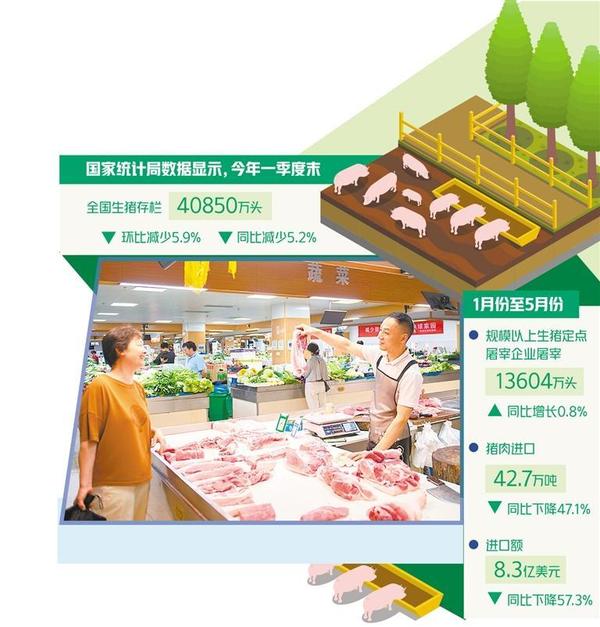 國家統(tǒng)計局數(shù)據(jù)顯示,今年一季度末,全國生豬存欄40850萬頭,環(huán)比減少5.9%,同比減少5.2%。一季度,全國生豬出欄19455萬頭,同比下降2.2%;豬肉產(chǎn)量1583萬噸,同比下降0.4%。5月末能繁母豬存欄3996萬頭,環(huán)比增長0.2%,同比下降6.2%。1月份至5月份規(guī)模以上生豬定點屠宰企業(yè)屠宰13604萬頭,同比增長0.8%。2月份開始屠宰量低于上年同期,5月份規(guī)模以上生豬定點屠宰企業(yè)屠宰2666萬頭,同比下降5.0%。